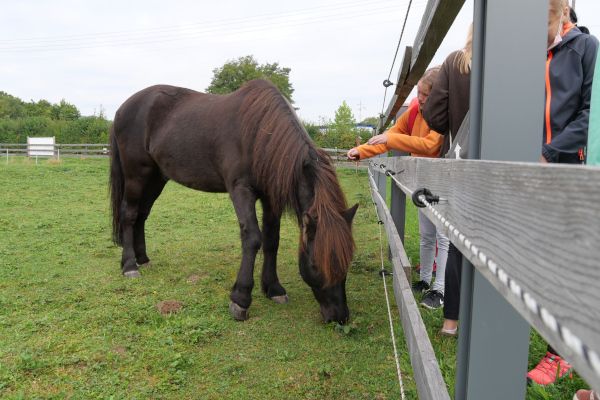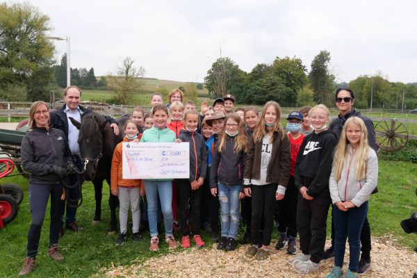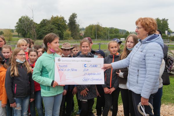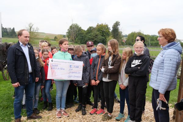 Die Begleitung von Familien mit todkranken Kindern oder von trauernden Kindern, die nahe Angehörige verloren haben, hat sich das Projekt „Wind in der Mähne“ des Kinder- und Jugendhospizdienstes der Malteser in Günzburg mit vielen ehrenamtlichen Helfern zur Aufgabe gemacht. Diese wertvolle Arbeit wurde nun vom „AK Soziales“ des Johann-Michael-Sailer-Gymnasiums Dillingen mit einer Summe von 1000 Euro unterstützt. Das Geld stammt aus dem Erlös eines Spendenlaufs von Schülern, Eltern und Lehrern, den der Arbeitskreis im vergangenen Schuljahr in Zusammenarbeit mit der Fachschaft Sport organisiert hatte. Stolzer Überbringer des Spendenschecks war die Klasse 6c des Sailer-Gymnasiums, die dazu am Wandertag Ende September mit ihrer Klassenlehrerin Ute von Egloffstein das „Seelengrübchen“ in Glött besuchte. Auf diesem kleinen Hof leben fünf Islandpferde, die zu Therapiezwecken für das Projekt „Wind in der Mähne“ eingesetzt werden.