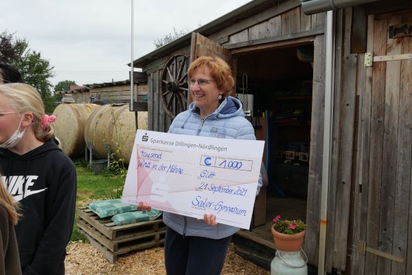 Einen Scheck über 1000 Euro aus dem Erlös eines Spendenlaufs am Sailer-Gymnasium nahm Sylvia-Maria Braunwarth stellvertretend für das Projekt „Wind in der Mähne“, das vom Jugendhospizdienst der Malteser in Günzburg organisiert wird, aus den Händen von Schülern entgegen.