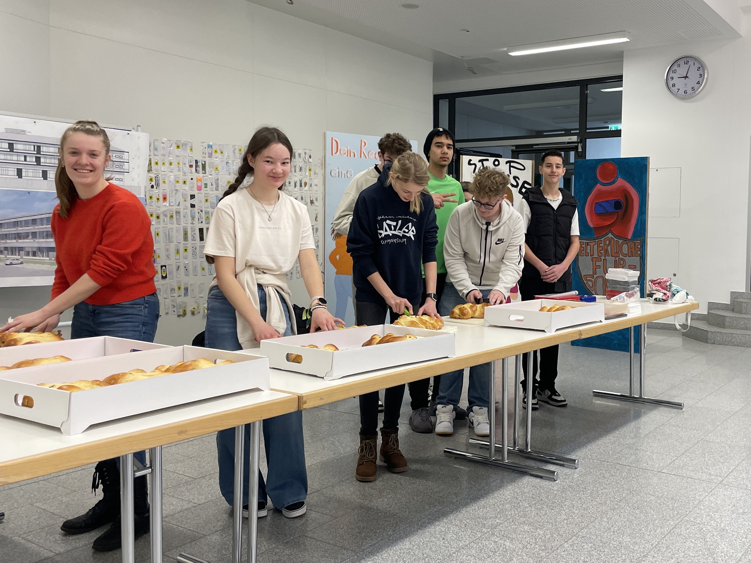 Zur Fastenzeit bot der AK Soziales wieder Hefezöpfe an. Fleißige Schülerinnen und Schüler verkauften aktiv Fastenzopf in den beiden Pausen. Mit dem Erlös wurde im Jahr 2024 die Dillinger Tafel unterstützt. Jörg Roller, der Koordinator der Dillinger Tafel, kam mit zwei Mitarbeitern, um die vom AK Soziales aufgestockte Spende in Höhe von 500 € entgegenzunehmen.