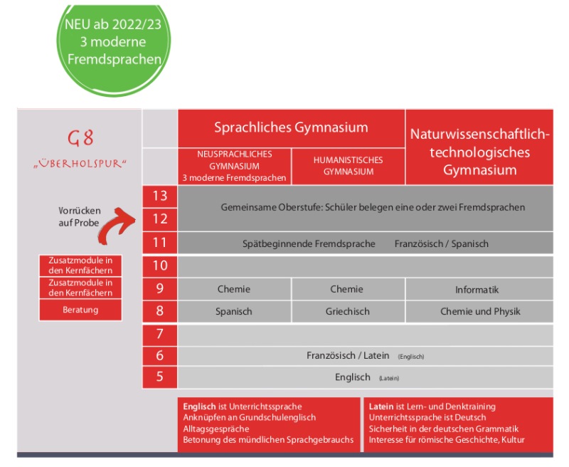 Ab dem Schuljahr 2022/23 legen sich bei uns die Schülerinnen und Schüler mit der Wahl von Französisch als 2. Fremdsprache nicht mehr automatisch auf das NTG fest, sondern sie können sich ab der 8. Jahrgangsstufe mit Spanisch als 3. Fremdsprache auch für das Sprachliche Gymnasium entscheiden. Bisher war Latein Voraussetzung für das Sprachliche Gymnasium. Die Wahl der zweiten Fremdsprache ist somit nicht mehr von vorentscheidender Bedeutung für die spätere Zweigwahl.